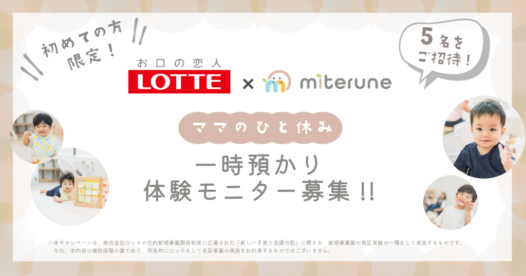 お菓子メーカー「ロッテ」と「miterune」がコラボして、未就園児ママ向けの“一時預かり体験モニター”を募集します🍬
